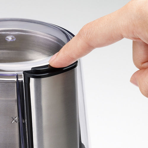 指1本でスイッチ押すだけの簡単操作。クリアカバーから覗き込み、スイッチを断続的に押して、好みの挽き加減にしていきます。